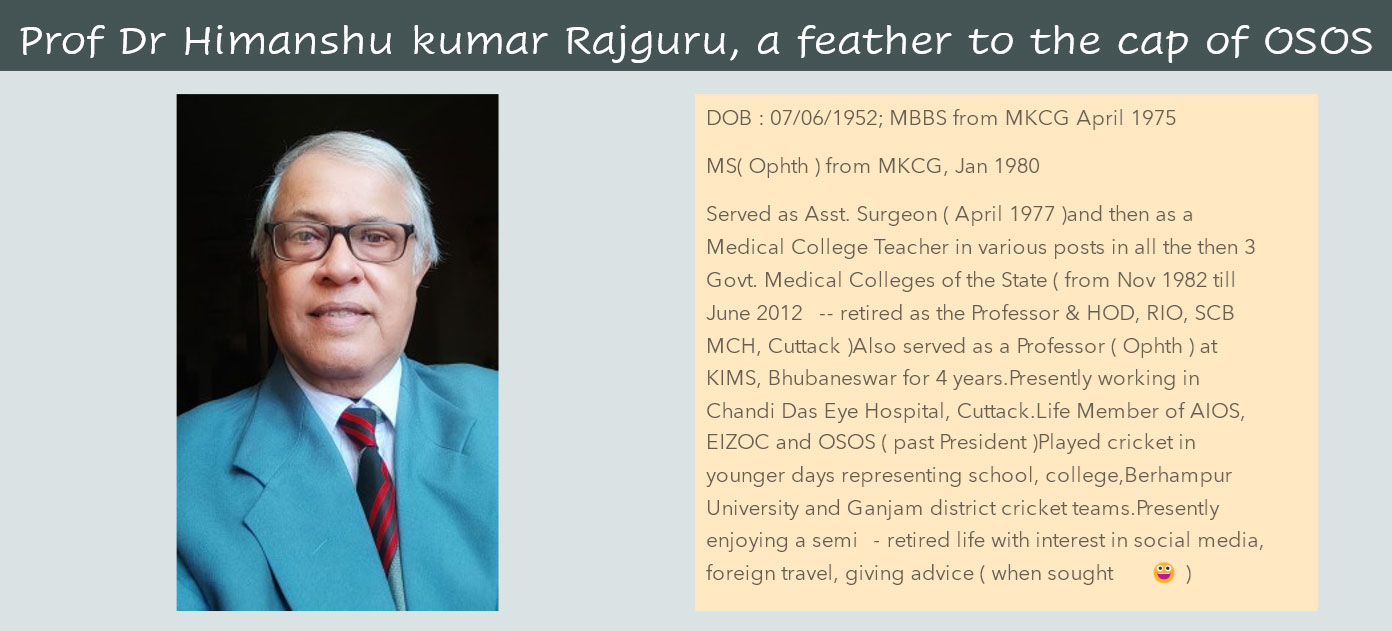 The Odisha State Ophthalmological Societ  was formed in the year 1969 by three members and wasregistered by Registrar of Societies on 15th July 1970 under Societies Registration Act (No XXI of 1860) at Cuttack. The Aims and Objectives of the Society are:
